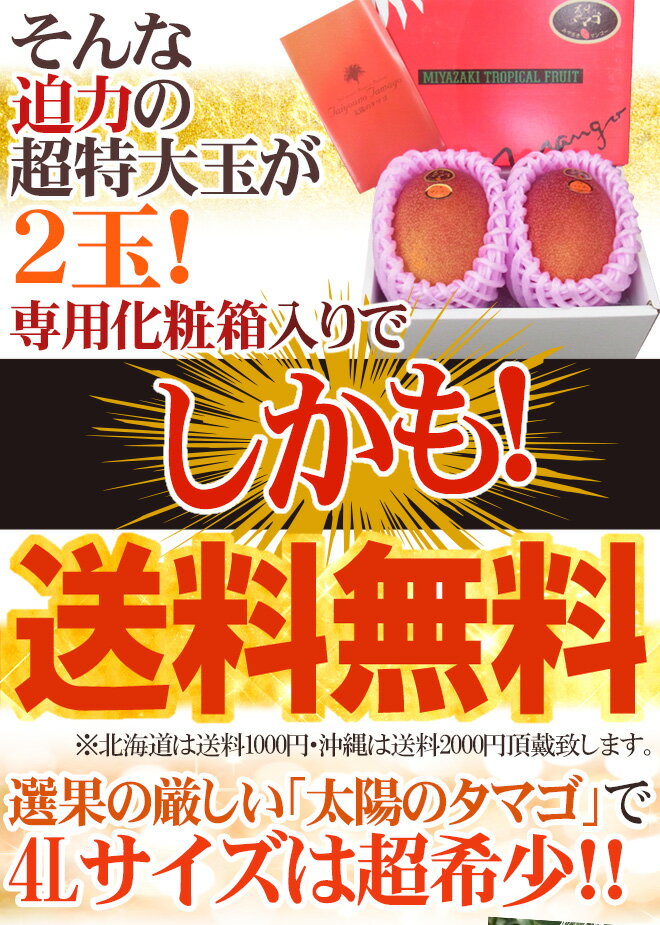 生産地 宮崎県 内容量 4L(一玉重量約510g〜649g)2玉 等級・サイズ 太陽のタマゴ 保存方法 冷暗所・冷蔵庫で保管し、なるべくお早目にお召し上がりください。