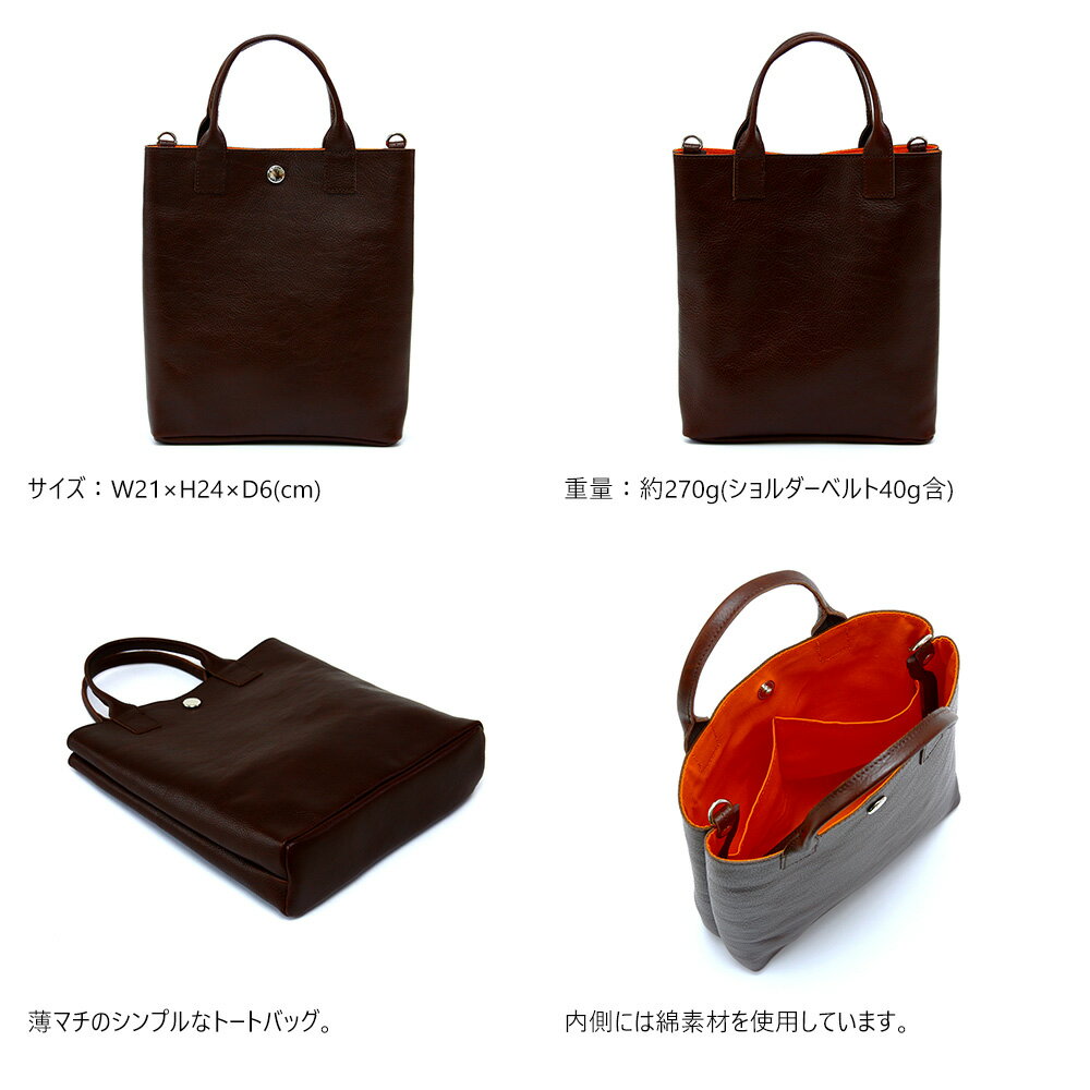 Detail 商品説明 ■素材:牛革 ■サイズ:W21× H24× D6(cm) ■重量:約270g(ショルダーベルト40g含) 縦型でシャープな顔の本体には、長財布やスマホ、化粧ポーチ、350〜500mlのボトルやタンブラーが縦に収まり、ランチタイムの移動時などにちょうどよいサイズ感が魅力。